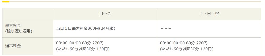 (平日は当日中24時まで最大800円、日付をまたぐことで課金開始されます)